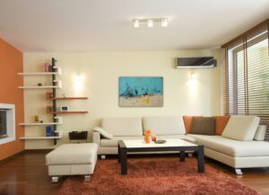 הדמיה של ציור מופשט בגווני סגול תלוי על קיר כקנבס במבואה כשלמרגלותיו שתי כורסאות ועציץ. התמונה מצורפת למאמר בנושא תשובות לשאלות נפוצות