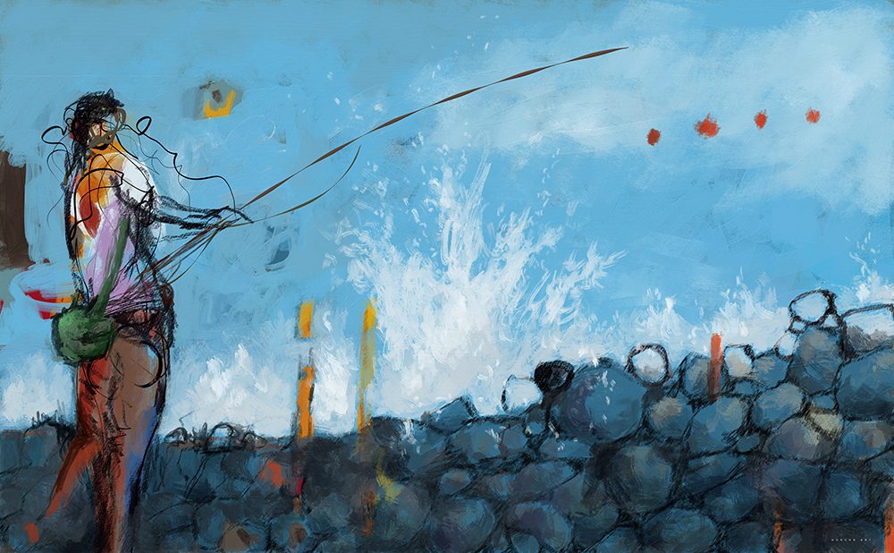 הציור נשלט על ידי קומפוזיציה דינמית, המדגישה את הקו האלכסוני של החכה ומנתב את מבטו של הצופה מהדמות אל האנרגיה המתפרצת של הגל והים.