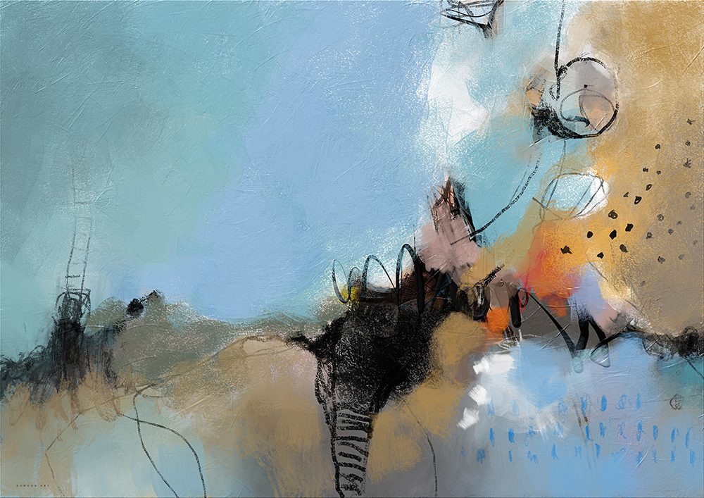 הכחול והתכלת הרגועים שולטים ברקע, מזכירים אור יום או את מעמקי הים, ומתמזגים עם גווני האדמה החמים, חום וזהב. הקווים השחורים, החופשיים והמפותלים, פורצים מתוך הצבע, יוצרים עוגן ויזואלי ומכניסים תנועה ודינמיות לקומפוזיציה.