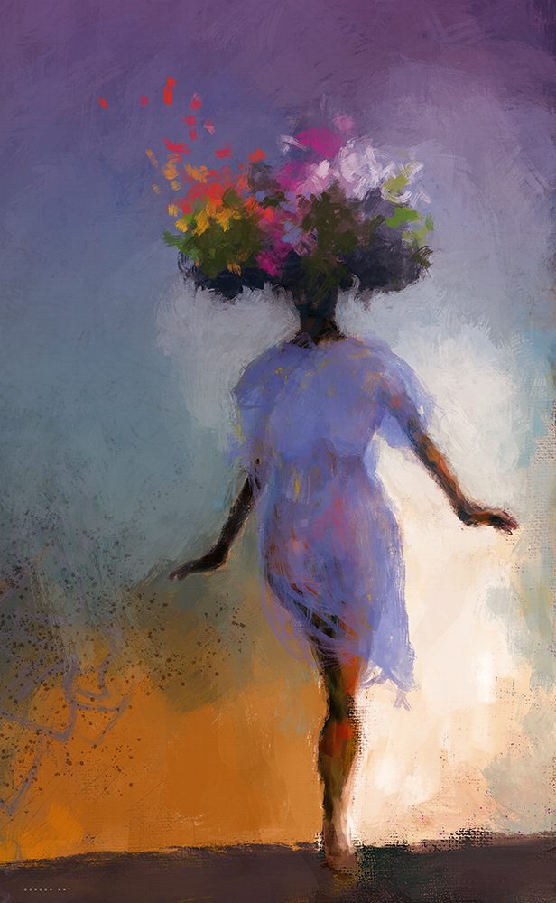 היא פוסעת לה דומם, על ראשה זר פרחים ענק וצבעוני, כאילו היא נושאת את כל היופי והשמחה למעלה על ראשה.