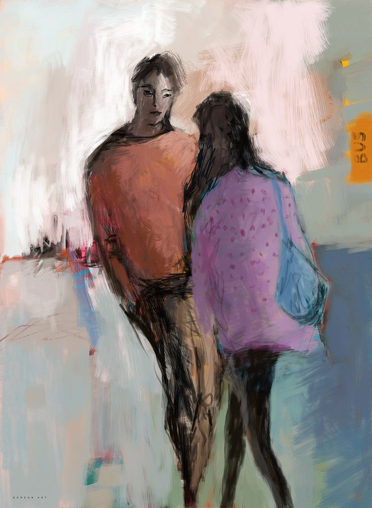 היצירה "פגישה מקרית" לוכדת רגע חולף של קשר אנושי בלב העיר הגועשת. במשיכות מכחול דינמיות ובפלטת צבעים הנעה בין ורוד רך לכחול עמוק, מנציח האמן את המתח המרתק שבין המקרי לנצחי. זהו ציור שמעורר תהייה על הסיפורים המסתתרים מאחורי דמויות רחוב אנונימיות, גבר ואישה שנפגשים באקראי בתחנת האוטובוס.