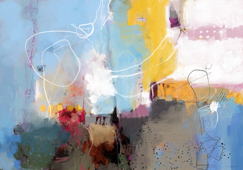 מופשט חגיגי" (Festive Abstraction) הוא שיר הלל לצבע ולתנועה חופשית. ביצירה זו, גוני צהוב בהיר ותכלת שמיים משתלבים עם נגיעות של סגול עמוק ואפור אורבני, כשמעליהם מרחף רישום לבן וקליל המזכיר תנועת מנצח או שובל של חגיגה. הקומפוזיציה מלאה באור ואופטימיות, ומעניקה תחושה של התחדשות ומרחב פתוח.