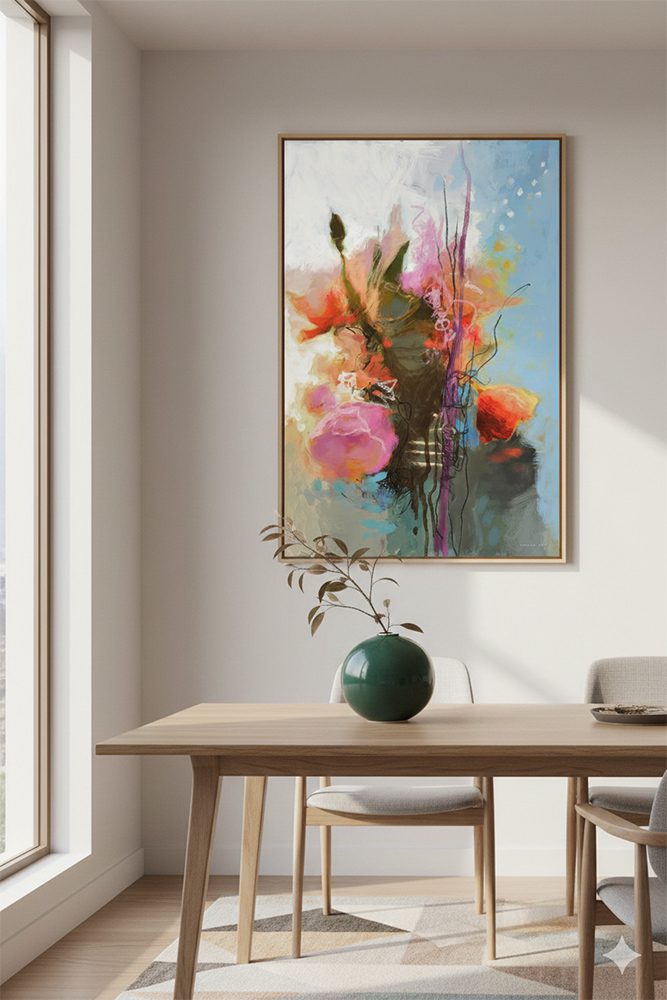 הציור "חג שמח" הוא חגיגה ויזואלית של צבע ותנועה, הציור האנכי משלב כתמי צבע עזים בטכניקה מופשטת המזכירה פריחה אביבית משמחת. היצירה מוסיפה אור, חיוניות ואופטימיות לכל חלל מעוצב.