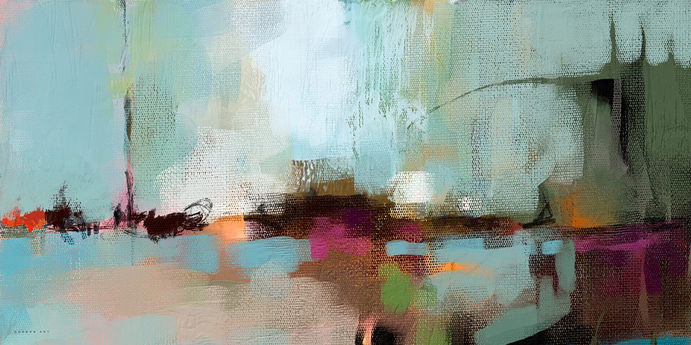שברי זיכרונות על המים" יצירה מופשטת מאת איש גורדון המזמינה את המתבונן למסע בין שכבות של צבע, רגש וזמן. הציור נולד מתוך חקירה של רגעי דמדומים, שבהם קו האופק מיטשטש והשתקפויות של אור משחקות על פני המים במעגן או ספינה מופשטים. השילוב בין גוני התכלת המרגיעים לבין נגיעות חמות של כתום ומג'נטה יוצר מתח פיוטי כמו זיכרונות רחוקים שצפים ועולים אל פני השטח. הקומפוזיציה האופקית ומשיכות המכחול העזות מעניקות לחלל תחושה של עומק, שקט ותנועה מתמדת.