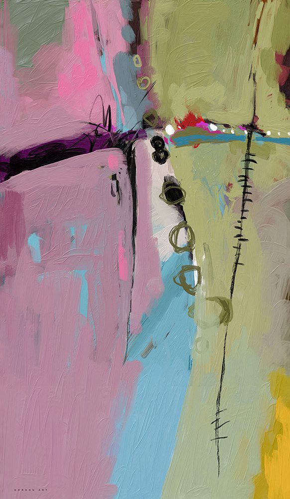 ציור מופשט אנכי "פטל פינת פיסטוק" מאת איש גורדון – מפגש צבעוני, משעשע ונועז בין גוני פטל עמוקים לנגיעות פיסטוק רעננות, בקומפוזיציה מלאת תנועה ואופי.