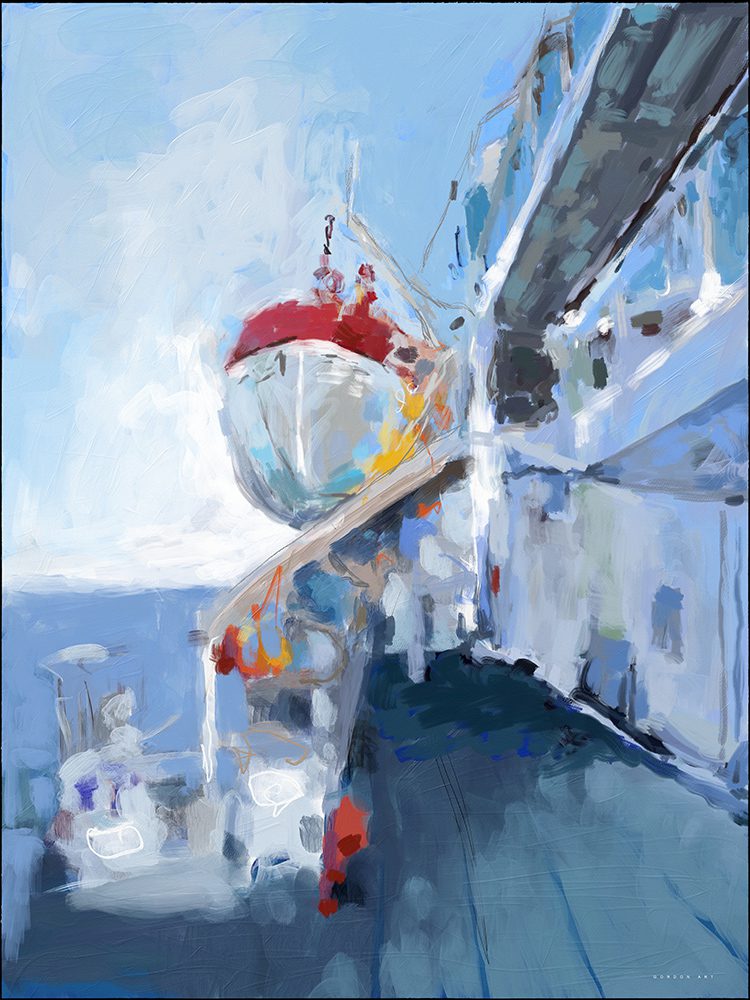 ישנם רגעים שבהם הזמן עומד מלכת, גם כשהספינה נמצאת בתנועה מתמדת. היצירה "הפלגנו עם שחר" לוכדת בדיוק את הרגע הזה – השעה המוקדמת שבה האור הלבן והבהיר משתקף על הסיפון, והכחול של השמיים והים מתמזגים ליחידה אחת של חופש.