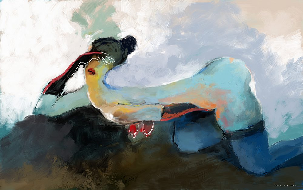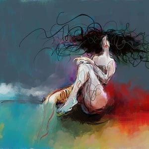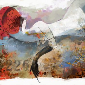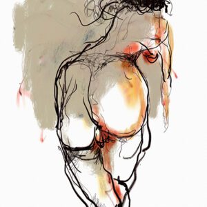 הציור "נגיעה אלוהית" (The Divine Touch) לוכד רגע אינטימי שבו הגוף הנשי מתמזג עם מרחב מופשט של צבע ותנועה. כתמי התכלת הקרירים פוגשים נגיעות של כתום חם וקווי מתאר לבנים ועדינים, היוצרים תחושה של התעלות חושנית מעבר לחומר.