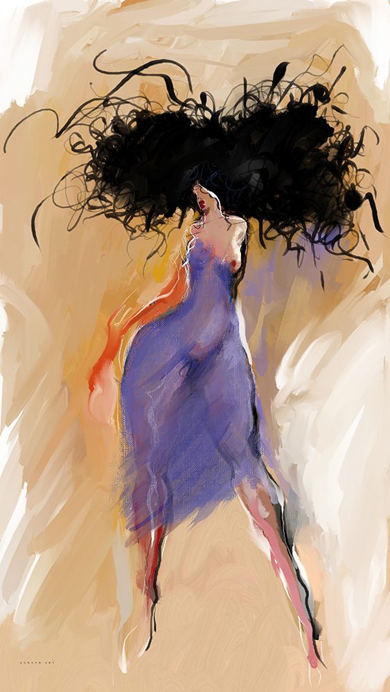 הציור "השמלה הסגולה" (The Purple Dress) הוא יצירה אקספרסיבית עוצמתית המביאה לידי ביטוי תנועה רגשית חסרת עכבות. במרכזה דמות נשית בעלת נוכחות פראית, המודגשת על ידי רעמת שיער שחורה, פראית ומוגזמת, ושמלה סגולה שקופה למחצה המרחפת על הבד. נגיעה של כתום עז ביד הדמות מוסיפה רובד של חיוניות מתפרצת.